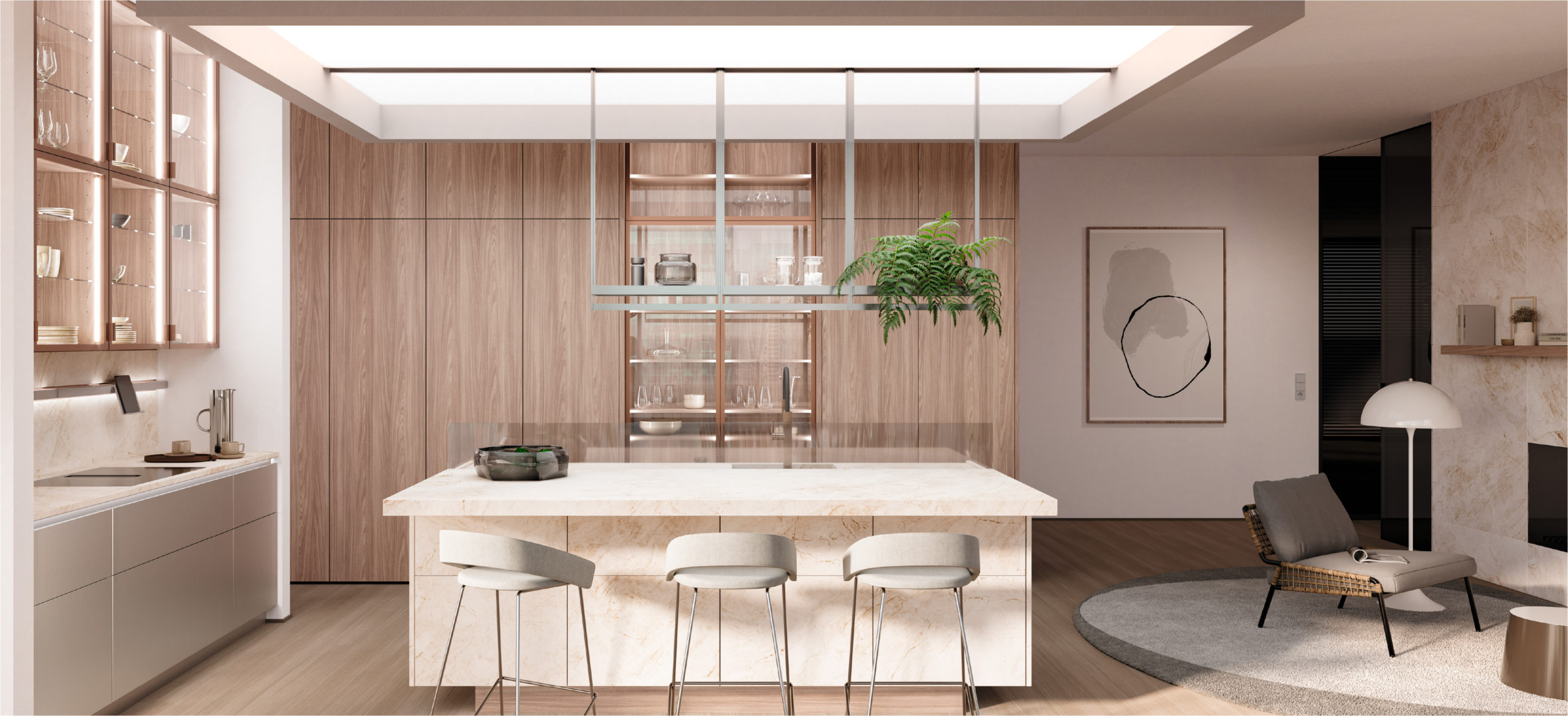 L’élégance de la cuisine Taj Mahal se prolonge dans les vitrines en verre Vero. Ces modules associent transparence, matériaux nobles, cadres en aluminium et éclairage intégré.