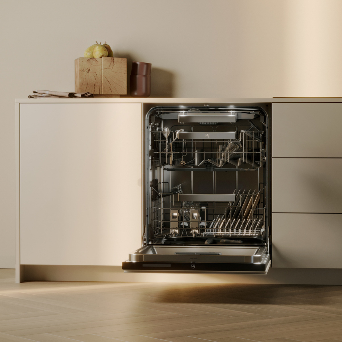 L’innovation est une valeur clé chez V-ZUG. Le fabricant détient plusieurs brevets, comme le SteamFinish pour les lave-vaisselles : une vapeur produite à la fin du cycle de séchage qui se condense sur les verres, l’argenterie et les autres pièces de vaisselle. Cette eau extrêmement pure élimine les résidus ainsi que les traces de détergent et d’agent de rinçage, assurant un résultat impeccable.