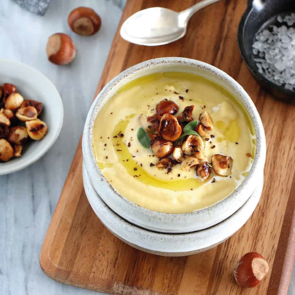 - Servez le velouté en ajoutant les noisettes grillées par-dessus et dégustez !
